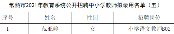 常熟市人力資源和社會保障局、常熟市教育局組織面向社會公開招聘中小學教師,通過筆試、面試、體檢、政審,現(xiàn)對擬錄用人員進行公示,期限七天。從公示之日起,社會各界均可對公示對象的有關(guān)情況進行反映。反映請用書面署名材料或直接到中共常熟市紀委監(jiān)委派駐市教育局紀檢監(jiān)察組反映,反映情況和問題必須實事求是,客觀公正。反映人必須提供真實姓名及聯(lián)系方式,以示負責,對不署名的一般不予受理。中共常熟市紀委監(jiān)委派駐市教育局紀檢監(jiān)察組對反映人和反映情況將嚴格保密。受理部門:中共常熟市紀委監(jiān)委派駐市教育局紀檢監(jiān)察組(聯(lián)系電話:52707573,52707135)。