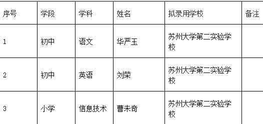 根據(jù)《2021年蘇州大學(xué)第二實驗學(xué)校補充招聘年金制教師簡章》規(guī)定,經(jīng)公開報名、筆試、面試、考察(政審)、體檢等程序,初步確定擬錄取以下3名同志為相城區(qū)年金制教師,現(xiàn)予以公示,公示時間為7個工作日(9月3日—13日)。