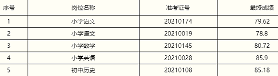 因小學(xué)小學(xué)語文20210158、小學(xué)語文20210083、小學(xué)數(shù)學(xué)20210025、小學(xué)英語20210118、初中歷史20210167的考生自愿放棄體檢、考察資格,現(xiàn)將5名遞補(bǔ)人員信息公告如下: