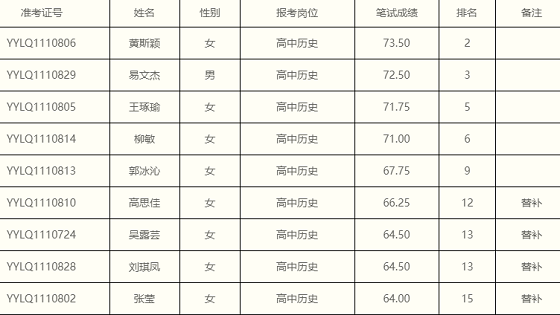 經(jīng)岳陽(yáng)樓區(qū)公開(kāi)招聘教師領(lǐng)導(dǎo)小組復(fù)核,現(xiàn)將高中歷史崗位面試入圍人員名單公示如下: