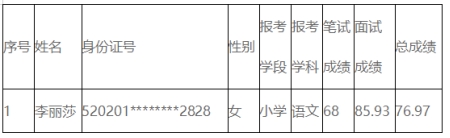 鐘山區(qū)2021年“特崗計(jì)劃”教師招聘選崗簽約工作已結(jié)束,最終小學(xué)語文崗位有一人放棄,現(xiàn)按照《六盤水市鐘山區(qū)2021年農(nóng)村義務(wù)教育階段學(xué)校教師特設(shè)崗位計(jì)劃招聘工作實(shí)施細(xì)則》規(guī)定,空缺的崗位按總成績(jī)從高分到低分排名順序依次遞補(bǔ)。按總成績(jī)排名順序,具體遞補(bǔ)人員情況如下: