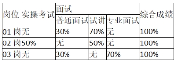 考試由實操考試、普通面試、試講、專業(yè)面試幾方面組成,具體要求及分值占比見下表: