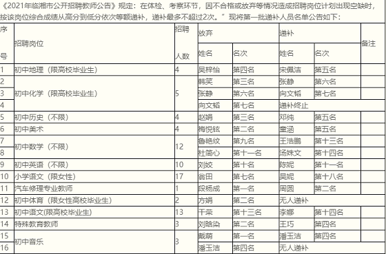 2021年湖南岳陽臨湘市公開招聘教師遞補人員名單公告(第一批)