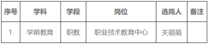 職業(yè)技術(shù)教育中心學(xué)前教育崗位1人選崗后放棄聘用資格,根據(jù)2021年公開招聘中小學(xué)及幼兒園教師第1號公告要求,對職業(yè)技術(shù)教育中心學(xué)前教育崗位進(jìn)行了遞補(bǔ),遞補(bǔ)人員體檢合格。現(xiàn)將其聘用情況進(jìn)行公示。
