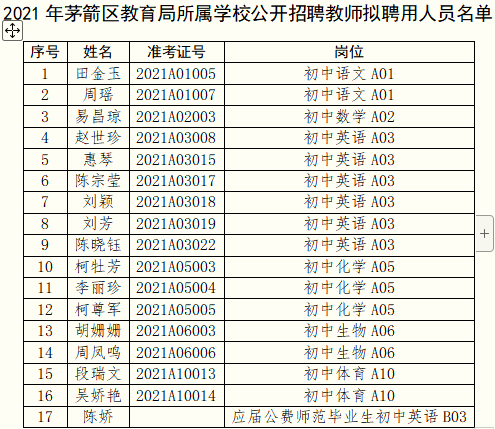 根據(jù)《2021年十堰市茅箭區(qū)教育局所屬學(xué)校公開招聘高層次人才、應(yīng)屆公費(fèi)師范畢業(yè)生公告》,經(jīng)面試(考核)、體檢和考察,現(xiàn)擬聘用田金玉等17名同志為茅箭區(qū)教育局所屬學(xué)校教師。公示時間為:2021年9月22日至9月29日。