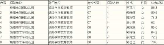 根據(jù)《2021年泉州市直有關(guān)學(xué)校招聘編外合同教師公告》《2021年泉州市直有關(guān)學(xué)校補(bǔ)充招聘編外合同教師公告》等精神,現(xiàn)將擬聘用人員及成績公示如下,公示時(shí)間:2021年9月23日--2021年9月30日。若有疑問,請(qǐng)咨詢0595-22781630。