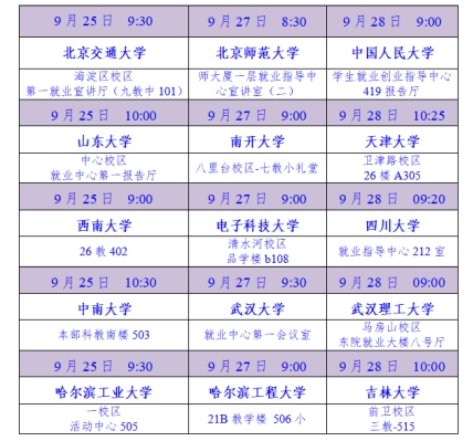 我校計(jì)劃于9月25日—9月28日在北京、天津、山東、重慶、成都、武漢、長沙、哈爾濱、長春等城市的15所一流高校組織開展校園宣講活動(dòng)。