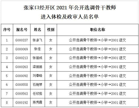 根據(jù)《張家口經(jīng)濟(jì)開發(fā)區(qū)2021年公開選調(diào)骨干教師公告》有關(guān)要求,小學(xué)教師崗位面試人數(shù)不足1:3比例的崗位,參照小學(xué)英語崗位錄取最低分?jǐn)?shù)確定錄取分?jǐn)?shù)線,中學(xué)教師崗位面試人數(shù)不足1:3比例的崗位,參照中學(xué)歷史崗位錄取最低分?jǐn)?shù)確定錄取分?jǐn)?shù)線,現(xiàn)將張家口經(jīng)開區(qū)2021年公開選調(diào)骨干教師進(jìn)入體檢及政審人員名單及有關(guān)注意事項(xiàng)通知如下: