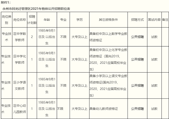 附件1:《永州市回龍圩管理區(qū)2021年教師公開招聘職位表》
