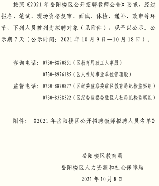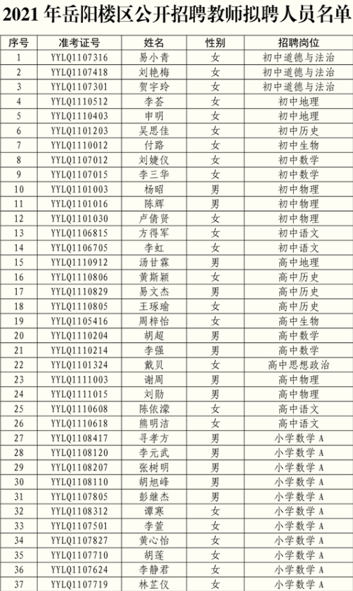 2021年湖南岳陽市岳陽樓區(qū)公開招聘教師擬聘人員名單公示