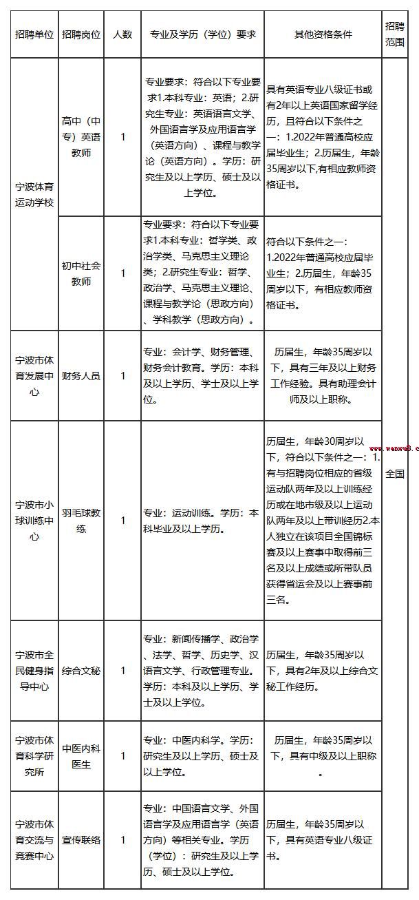 根據(jù)《寧波市事業(yè)單位公開招聘工作人員實施辦法》的有關(guān)規(guī)定,經(jīng)報市人力資源和社會保障局同意,市體育局直屬單位寧波體育運動學(xué)校、寧波市體育發(fā)展中心、寧波市小球訓(xùn)練中心、寧波市全民健身指導(dǎo)中心、寧波市體育科學(xué)研究所和寧波市體育交流與競賽中心,決定面向社會公開招聘事業(yè)編制工作人員7名,F(xiàn)就有關(guān)事項公告如下: