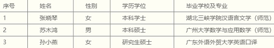 根據(jù)《2021年黃埔區(qū)教育局公開招聘會(huì)元學(xué)校教師公告》,按照招聘工作程序,現(xiàn)對(duì)擬聘用張曉琴等3名同志予以公示。公示期間對(duì)擬聘用人員如有異議的,請(qǐng)書面或電話向黃埔區(qū)教育局反映,反映情況的書面材料或電話要簽署或自報(bào)真實(shí)姓名并留聯(lián)系電話,以便核實(shí)有關(guān)情況。