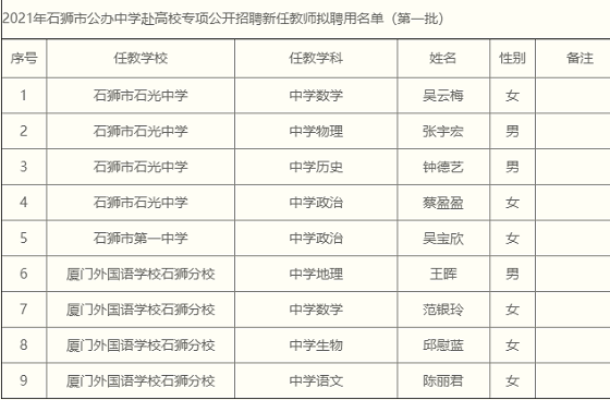 根據(jù)《2021年石獅市公辦中學(xué)赴高校專項公開招聘新任教師公告》規(guī)定的條件及招聘程序,現(xiàn)對擬聘用人員名單進行公示。公示時間:2021年10月12日-2021年10月20日。監(jiān)督電話:0595-88877229、0595-88767782。