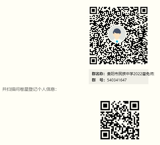 1.提交材料:凡符合應(yīng)聘條件者,請將個(gè)人簡歷(僅個(gè)人簡歷頁,pdf格式)發(fā)送至郵箱[emailprotected];掃描下方二維碼加入“貴陽市民族中學(xué)2022屆免師招聘”QQ群(未投簡歷的請勿加群)。