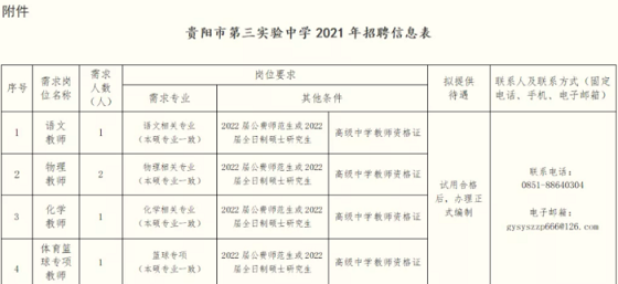 貴陽市第三實驗中學(xué)是貴州省一類示范性高中,學(xué)校秉承“剛健自強,止于至善”的校訓(xùn)精神,連續(xù)十四年獲得貴陽市入出口評估一等獎。學(xué),F(xiàn)有教職工217人,學(xué)生2400余人,為滿足學(xué)校教育教學(xué)需求,現(xiàn)面向教育部直屬6所師范院校應(yīng)屆公費師范畢業(yè)生及國內(nèi)外高校全日制應(yīng)屆碩士研究生招聘教師,具體要求如下: