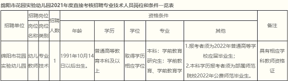 1.《綿陽市花園實(shí)驗(yàn)幼兒園2021年度直接考核招聘專業(yè)技術(shù)人員崗位和條件一覽表》