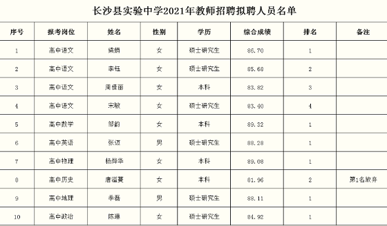 附件:長沙縣實驗中學(xué)2021年教師招聘擬聘人員名單