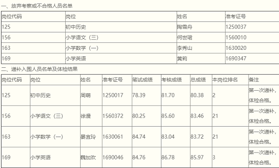 根據(jù)《2021年岳麓區(qū)面向社會公開招聘中小學(xué)、幼兒教師公告》“當(dāng)考察出現(xiàn)不合格或棄權(quán),則從同一崗位且考核成績在合格線以上人員中按總成績從高分到低分依次遞補(bǔ),若總成績相同時,按考核成績從高分到低分依次遞補(bǔ)(同一崗位遞補(bǔ)不超過兩次),經(jīng)體檢合格后進(jìn)入考察程序”,現(xiàn)將放棄考察或不合格及遞補(bǔ)入圍人員名單和體檢結(jié)果公示如下:
