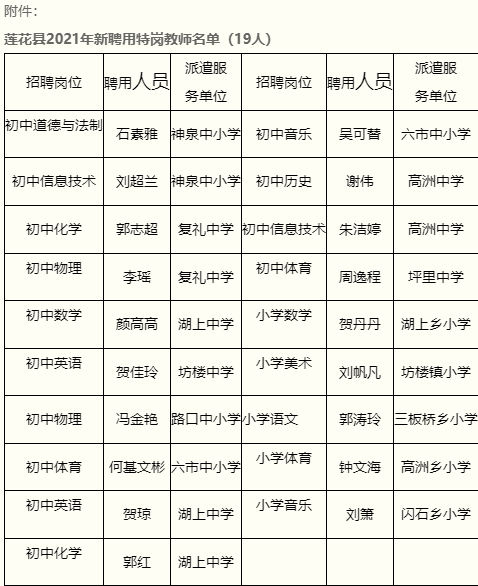 附件:蓮花縣2021年新聘用特崗教師名單(19人)