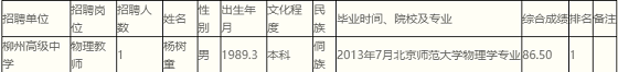 根據(jù)《柳州市2021年度事業(yè)單位中高級(急需緊缺)人才公開招聘公告(第三批)》要求及安排,楊樹童同志經(jīng)考核、體檢合格,符合聘用條件。經(jīng)研究決定,擬聘用楊樹童同志為柳州高級中學(xué)工作人員,現(xiàn)予以公示,公示期7個工作日(2021年11月3日至2021年11月11日)。對擬聘用的同志如有異議,請以書面形式,并署真實姓名和聯(lián)系地址,于2021年11月11日前郵寄或直接送我單位(郵寄地址為::柳州市高新五路26號;郵編:545006,電話0772-2696608),群眾如實反映有關(guān)問題受法律保護(hù)。