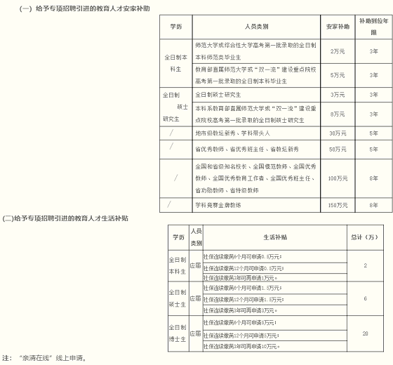 對(duì)自主申報(bào)入選“海外人才計(jì)劃”“萬(wàn)人計(jì)劃”的人才,市本級(jí)按照上級(jí)獎(jiǎng)勵(lì)或補(bǔ)助資金1:1進(jìn)行獎(jiǎng)勵(lì)。對(duì)新引進(jìn)并經(jīng)認(rèn)定的B類、C類、D類人才,分別給予50萬(wàn)元、30萬(wàn)元、20萬(wàn)元生活補(bǔ)貼;并對(duì)在杭州地區(qū)首次購(gòu)買(mǎi)住房分別給予200萬(wàn)元、150萬(wàn)元、100萬(wàn)元的購(gòu)房補(bǔ)貼。