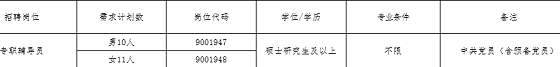 本次專職輔導(dǎo)員招聘計(jì)劃為21人,其中男性10人、女性11人,全部納入學(xué)校正式事業(yè)編制,具體招聘計(jì)劃如下: