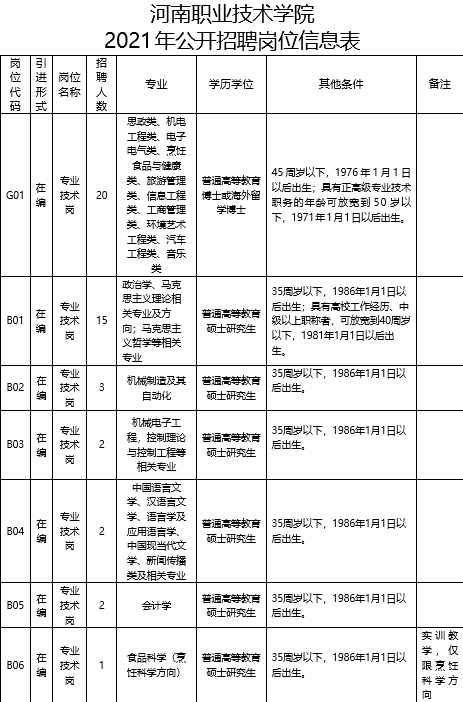 附件:1.河南職業(yè)技術(shù)學(xué)院2021年公開招聘崗位信息表