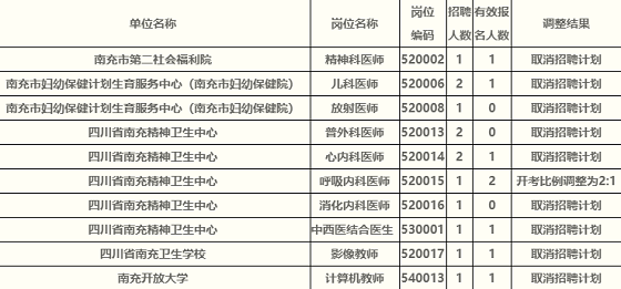 根據(jù)《南充市市屬事業(yè)單位2021年下半年公開招聘工作人員公告》《南充市市屬學(xué)校(單位)2021年下半年公開考試招聘教師公告》的規(guī)定和報(bào)名情況,部分崗位因報(bào)名人數(shù)未達(dá)到開考比例,需對崗位招聘計(jì)劃進(jìn)行調(diào)整,現(xiàn)將調(diào)整情況予以公告。