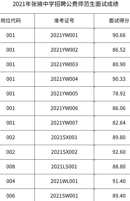 現(xiàn)將2021年張掖中學(xué)招聘公費(fèi)師范生面試成績(jī)公布如下:
