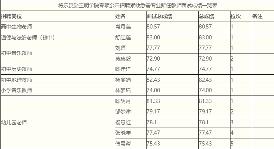附件:將樂縣赴三明學(xué)院專項(xiàng)公開招聘緊缺急需專業(yè)新任教師面試成績一覽表