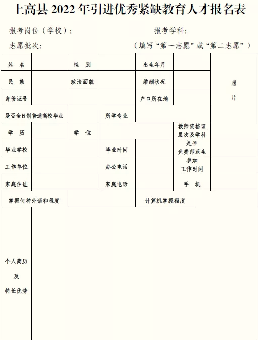 1.報名方式:請考生佩戴口罩,按照當(dāng)?shù)胤酪呦嚓P(guān)規(guī)定做好防護(hù)工作?忌痔顚懞玫摹渡细呖h2022年引進(jìn)優(yōu)秀緊缺教育人才報名表》(見附件)、畢業(yè)生推薦表、身份證、教師資格證、個人簡歷、榮譽(yù)證書、近期同底1寸免冠照片2張及其他相關(guān)證書等資料原件和復(fù)印件現(xiàn)場報名。