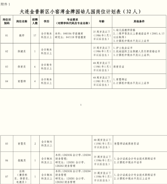 1.大連金普新區(qū)小窯灣金牌園幼兒園崗位計(jì)劃表