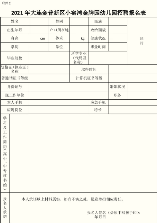 2.大連金普新區(qū)小窯灣金牌園幼兒園招聘報(bào)名表