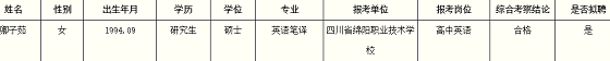 根據(jù)綿陽市涪城區(qū)人力資源和社會保障局、綿陽市涪城區(qū)教育和體育局2020年《關(guān)于考核招聘中小學(xué)教師的公告》規(guī)定,經(jīng)資格審查、面試、體檢、綜合考核等程序,現(xiàn)將擬聘人員(孕期延檢考生)基本情況進(jìn)行公示如下: