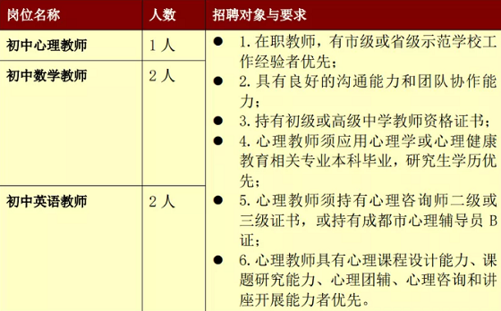 為提升辦學品質(zhì),辦好社會與人民滿意的公立學校,學校初中部決定面向社會招聘優(yōu)秀教師,待遇按成都市錦江區(qū)相關文件規(guī)定執(zhí)行。