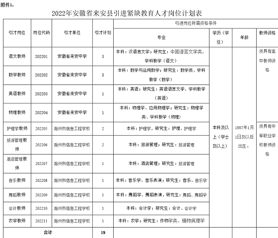 1.2022年安徽省來安縣引進(jìn)緊缺教育人才崗位計(jì)劃表
