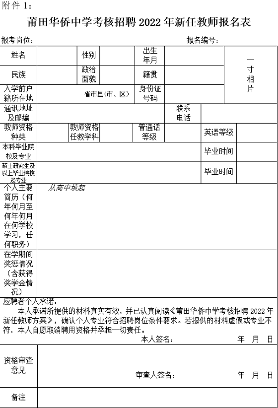 1.莆田華僑中學(xué)考核招聘2022年新任教師報名表