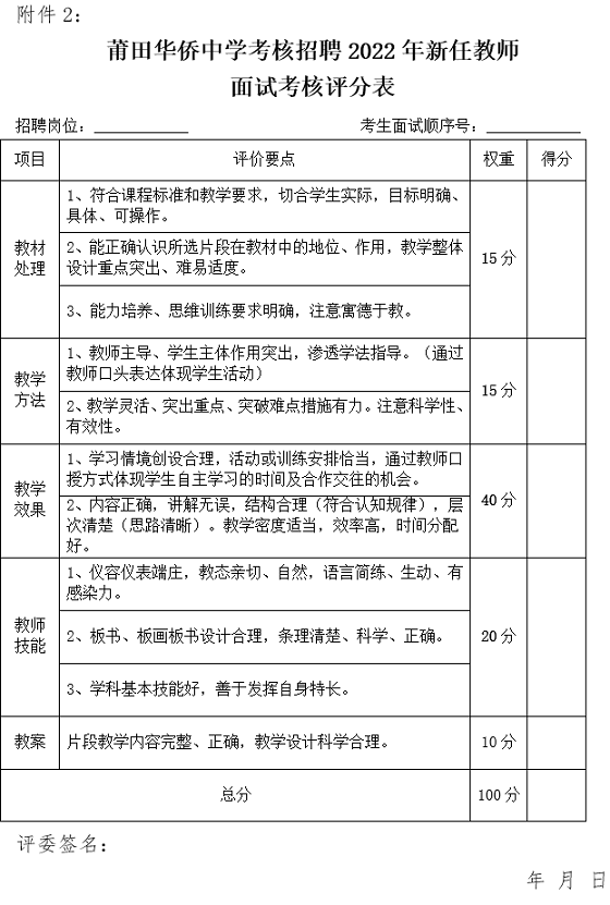 2.莆田華僑中學(xué)考核招聘2022年新任教師面試考核評分表