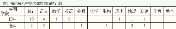 因工作需要,福州第八中學(xué)代課教師19名,具體招聘數(shù)附后,具體要求如下: