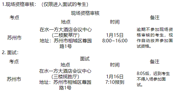現(xiàn)將1月15~16日蘇州市考點(diǎn)現(xiàn)場(chǎng)資格審核、面試等工作公告如下。
