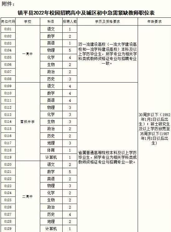 附件:鎮(zhèn)平縣2022年校園招聘高中及城區(qū)初中急需緊缺教師職位表