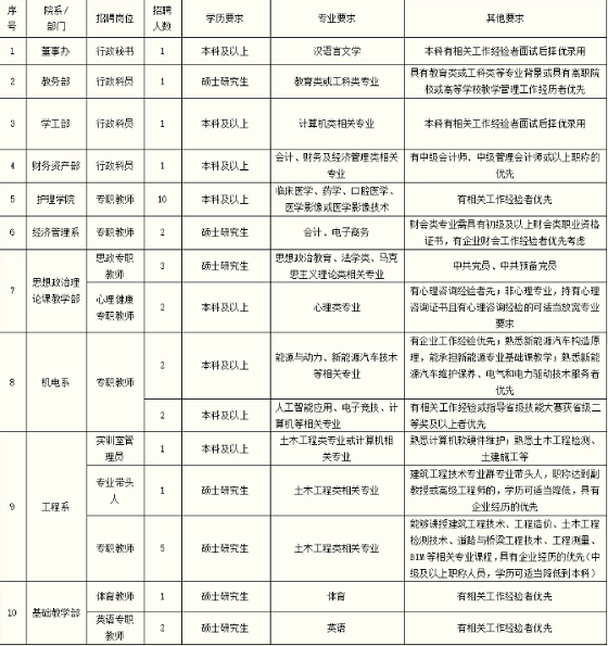 50周歲以下,本科及以上學(xué)歷,中級(jí)及以上職稱(chēng),計(jì)算機(jī)、人工智能、汽修、信息管理、旅游管理、烹飪與營(yíng)養(yǎng)、醫(yī)學(xué)類(lèi)、教育管理等專(zhuān)業(yè)或相近專(zhuān)業(yè)教育背景,本崗位工作經(jīng)歷超過(guò)3年以上;有對(duì)應(yīng)相關(guān)專(zhuān)業(yè)的教學(xué)科研工作經(jīng)歷;對(duì)專(zhuān)業(yè)(群)建設(shè)具有戰(zhàn)略性構(gòu)想和創(chuàng)新性思維;有帶領(lǐng)教師團(tuán)隊(duì)建設(shè)一流專(zhuān)業(yè)的能力;持副高級(jí)以上職稱(chēng)、碩士研究生與博士研究生優(yōu)先聘用。(博士、教授,男放寬至60周歲以下,女放寬至55周歲以下)。