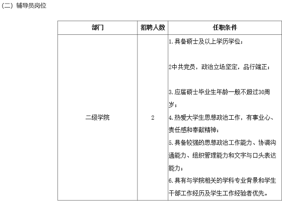 (四)輔導(dǎo)員:中共黨員,具有碩士及以上學(xué)歷學(xué)位,熱愛學(xué)生工作,作風(fēng)正派、樂于奉獻(xiàn)。