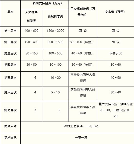 1.對于教學(xué)科研崗位全職引進的高層次人才,學(xué)校按照《安徽師范大學(xué)引進高層次人才和團隊實施辦法(試行)》(校人字〔2017〕75號)提供安家費、科研支持經(jīng)費等,標準如下(見表)(稅前,單位為人民幣,下同):