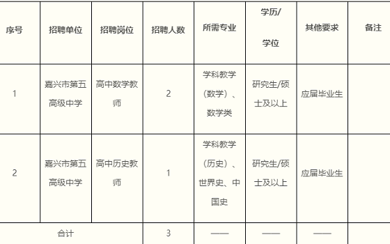 因教育教學(xué)工作需要,經(jīng)嘉興市人力資源和社會保障局備案,嘉興市嘉興市第五高級中學(xué)決定面向社會公開招聘事業(yè)編制教師3名。現(xiàn)將有關(guān)事項公告如下: