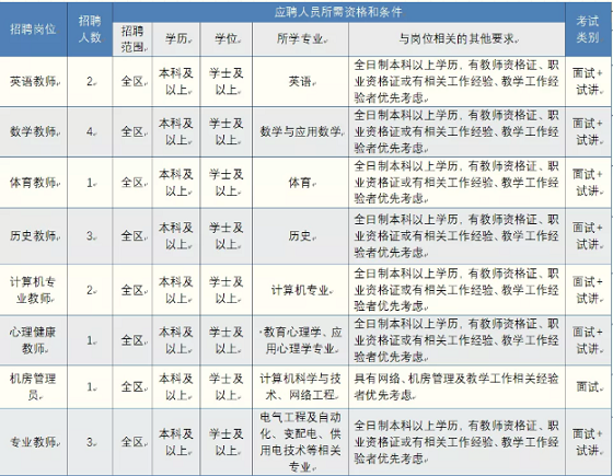 現(xiàn)因教學及管理需要,需招聘教師崗位共17個,其中數(shù)學教師4名,歷史教師、電氣專業(yè)教師各3名,英語、計算機教師各2名,體育、心理健康、機房管理專業(yè)教師各1名。具體要求見下方《寧夏水利電力工程學校公開招聘教師崗位計劃一覽表》。