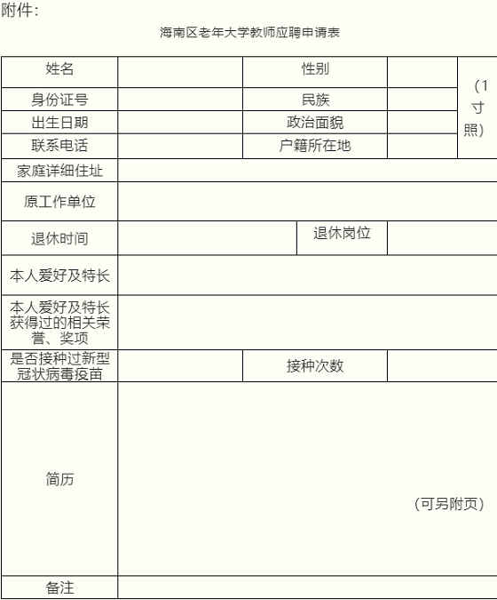 應(yīng)聘教師需填寫《海南區(qū)老年大學(xué)教師應(yīng)聘申請表》,見附件。