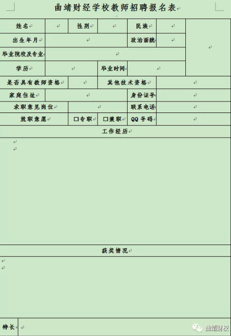 應(yīng)聘者可下載《曲靖財(cái)經(jīng)學(xué)校教師招聘報(bào)名表》(附件2),報(bào)名表填寫(xiě)后與個(gè)人簡(jiǎn)歷一同發(fā)送到指定郵箱(75358555@qq.com)。