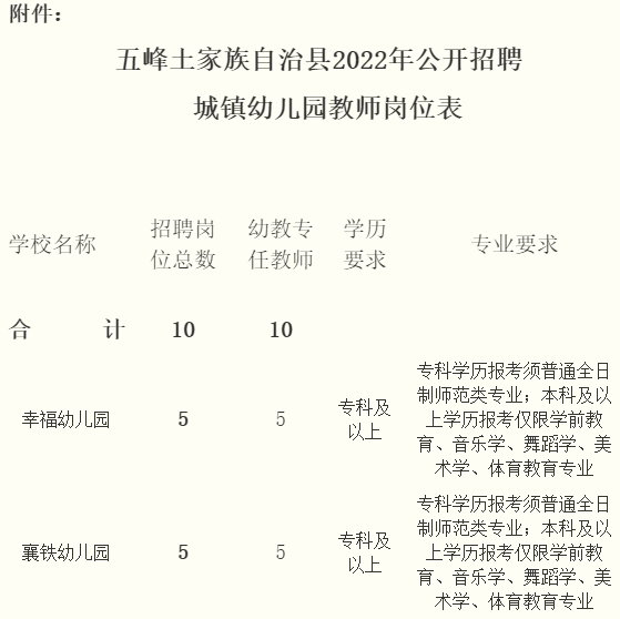 公開招聘城鎮(zhèn)幼兒園教師10名。招聘崗位見《五峰土家族自治縣2022年公開招聘城鎮(zhèn)幼兒園教師崗位表》(附后)。