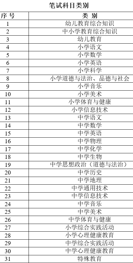 筆試科目:“專業(yè)知識”和“教育綜合知識”。“專業(yè)知識”共設(shè)31個科目類別(參見附件),由應(yīng)聘者根據(jù)本人所報考崗位類別選擇其中一個科目類別參加考試;“教育綜合知識”是每位應(yīng)聘者必考科目。